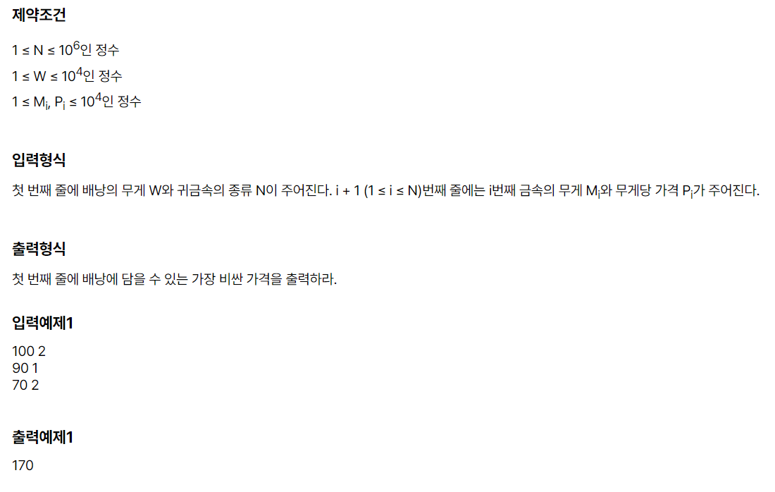 각 금속의 무게와 무게당 가격이 주어졌을 때 배낭을 채울 수 있는 가장 값비싼 가격은 얼마인가?