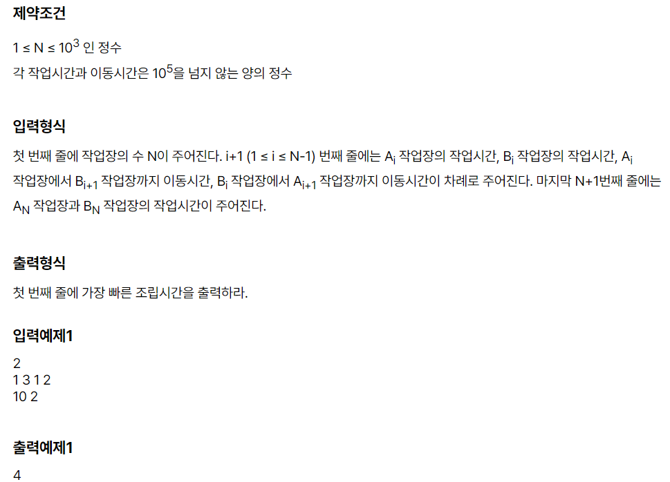 B 조립 라인도 동일한 방식으로 조립을 진행한다. Ai 작업장에서 Bi+1 작업장으로 혹은 Bi 작업장에서 Ai+1 작업장으로 반조립 제품의 이동이 가능(이동시간이 추가됨)할 때 자동차 1대의 가장 빠른 조립 시간을 구하여라.