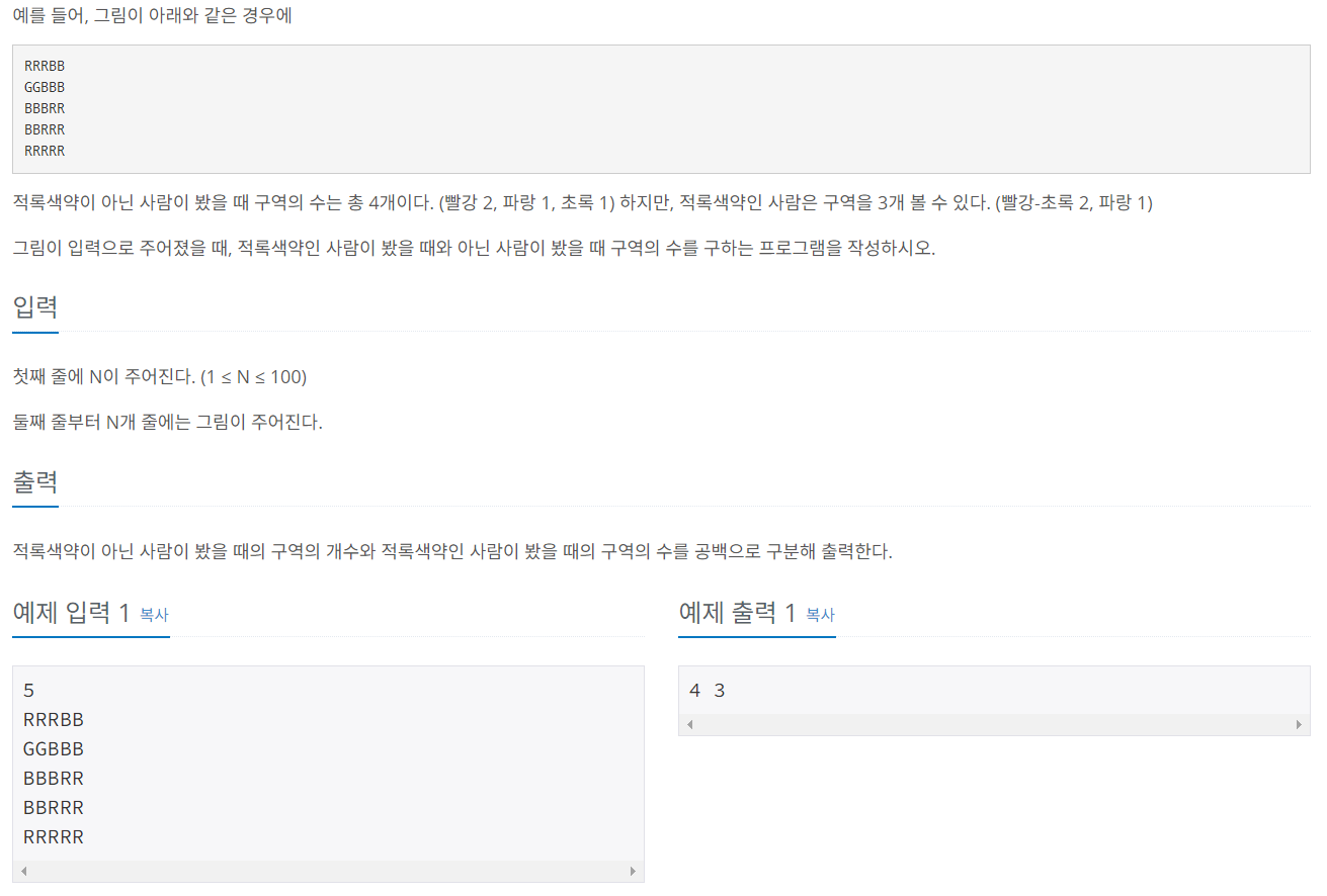 크기가 N×N인 그리드의 각 칸에 R(빨강), G(초록), B(파랑) 중 하나를 색칠한 그림이 있다. 그림은 몇 개의 구역으로 나뉘어 있는데, 구역은 같은 색으로 이루어져 있다. 또, 같은 색상이 상하좌우로 인접해 있는 경우에 두 글자는 같은 구역에 속한다. (색상의 차이를 거의 느끼지 못하는 경우도 같은 색상이라 한다)
