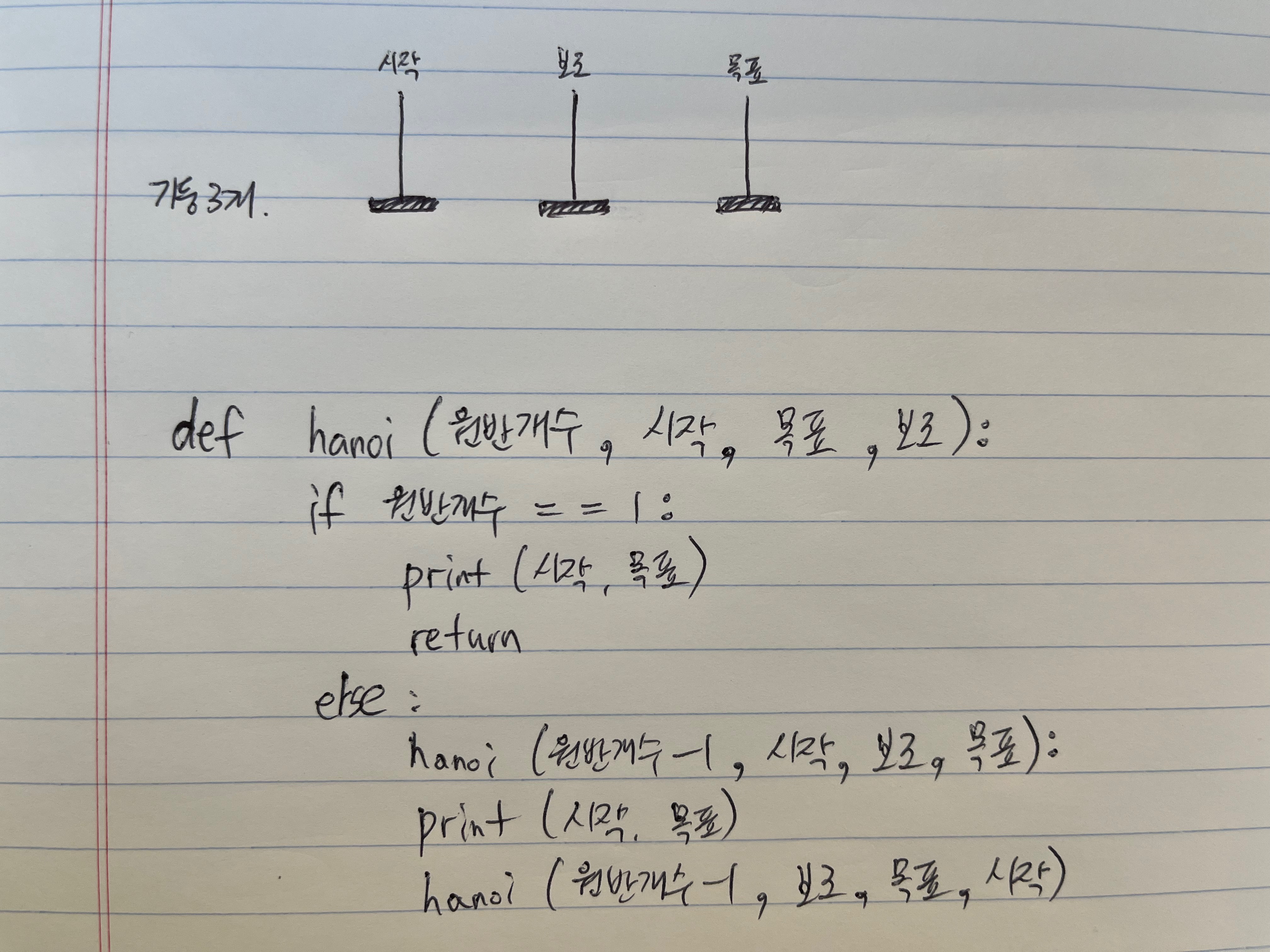 하노이 탑에서는 원반개수와 기둥 3개가 중요하다. 기둥 3개는 각 시작, 보조, 목표인 것을 잘 생각해야 된다.