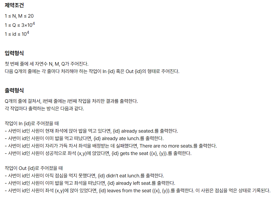 현재 식당에는 좌석 N×M개가 N행 M열로 나열되어 있는데, 각 좌석에는 (1,1)에서 (N,M)로 좌표가 배정되어 있다. x행 y열에 있는 좌석의 좌표는 (x, y)이다.