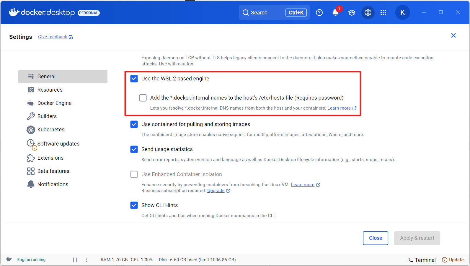 "Use the WSL 2 based engine" 옵션이 활성화되어 있는지 확인하기 !!