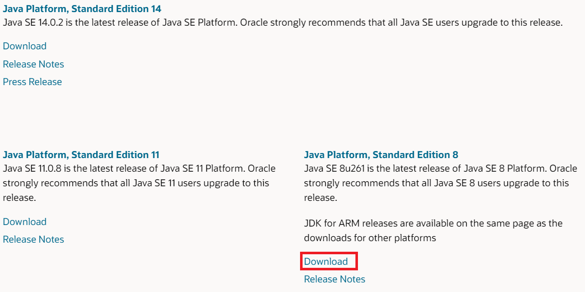 4. 들어가면 Java SE 8, 11, 14 버전이 있다.