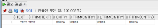 확인해보면 TRIM함수는 양쪽 여백, LTRIM함수는 왼쪽 여백, RTRIM함수는 오른쪽 여백을 제거한 것을 확인할 수 있다 :)