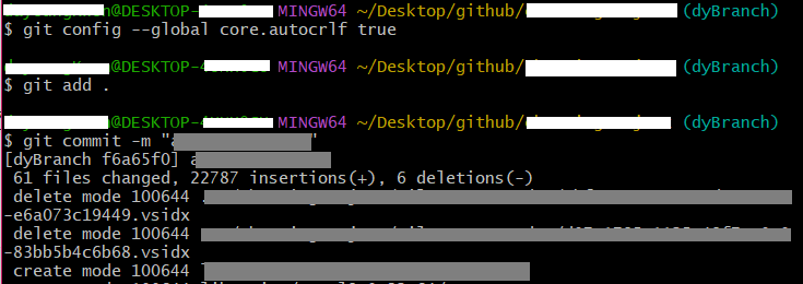 core.autocrlf 를 true값으로 변경해 주어서 $git add . 후에 정상적으로 commit 할 수 있었다.