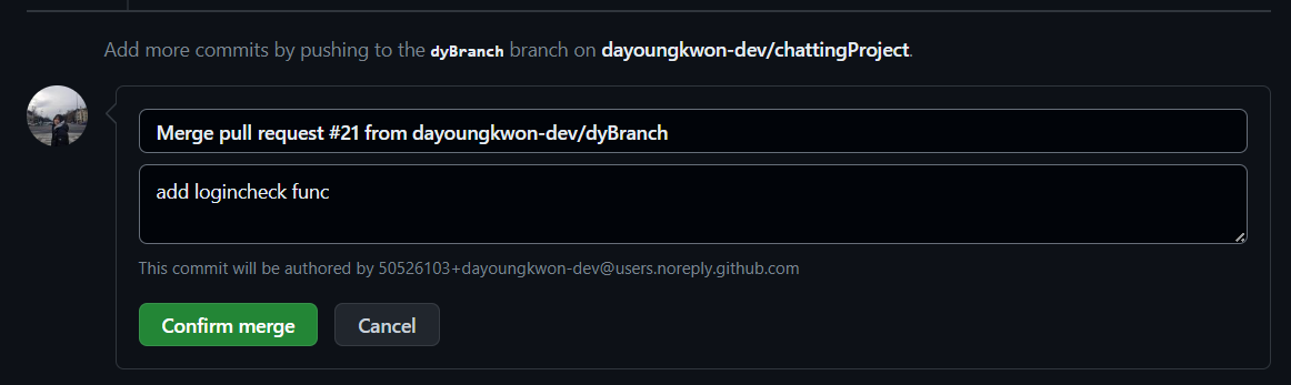 충돌 없이 Merge작업이 완료되면 Merge pull request 클릭.