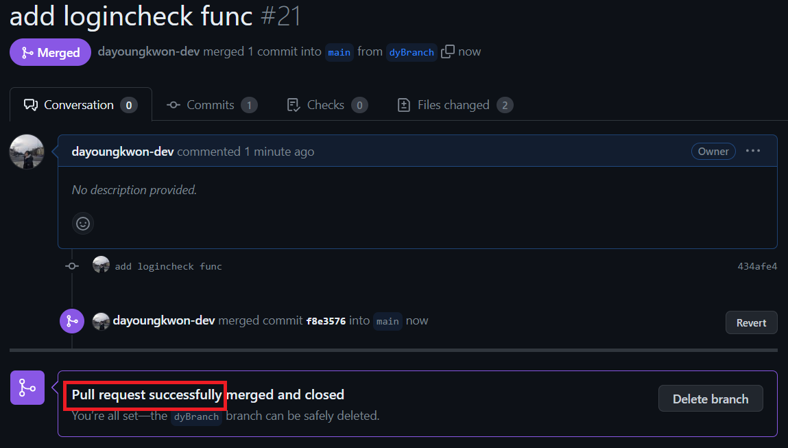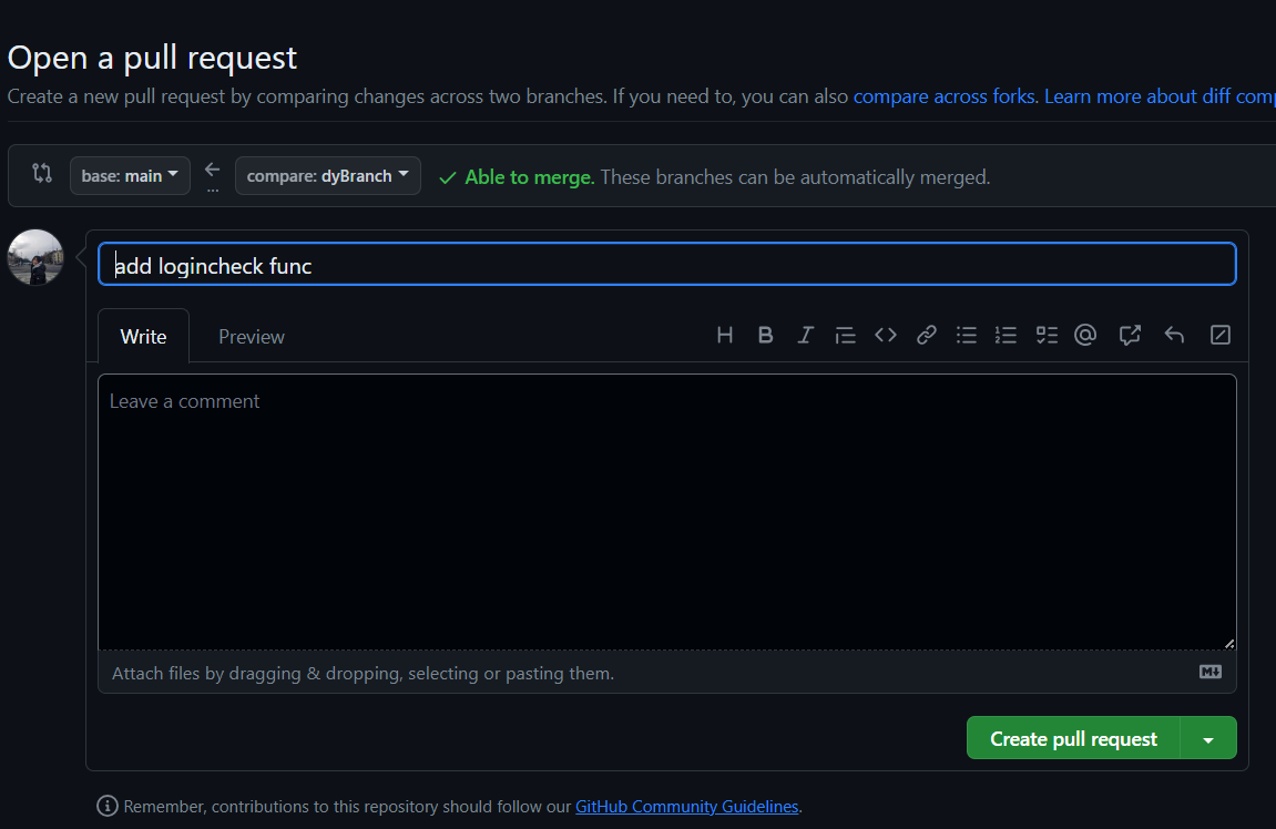 ▽ 웹 github에서 Compare & pull request 진행. merge 작업.