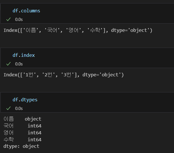 columns와 index를 조회해 보고, dtype으로 DataFrame의 자료형을 조회해 보면