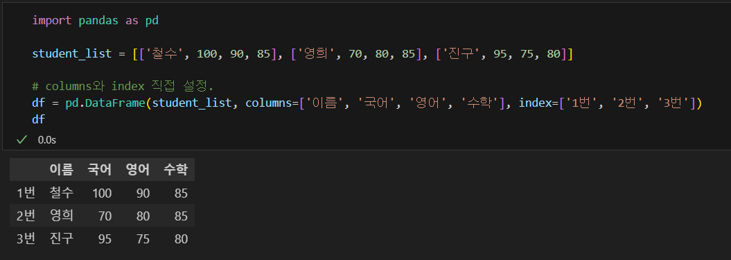 - Series : List와 다르게 index를 직접 지정할 수 있다. 설정을 안 해주면 0, 1, 2...로 설정됨.