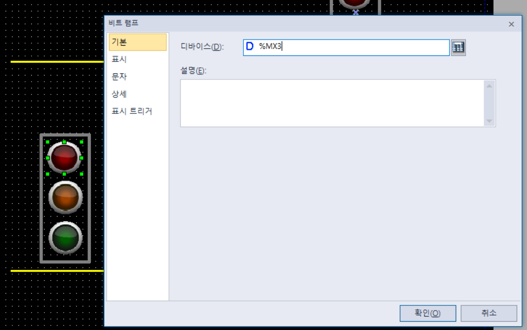 신호등 램프들은 비트 램프에 디바이스 값을 PLC에서 설정한 메모리 할당값이랑 통일시켜 준다.