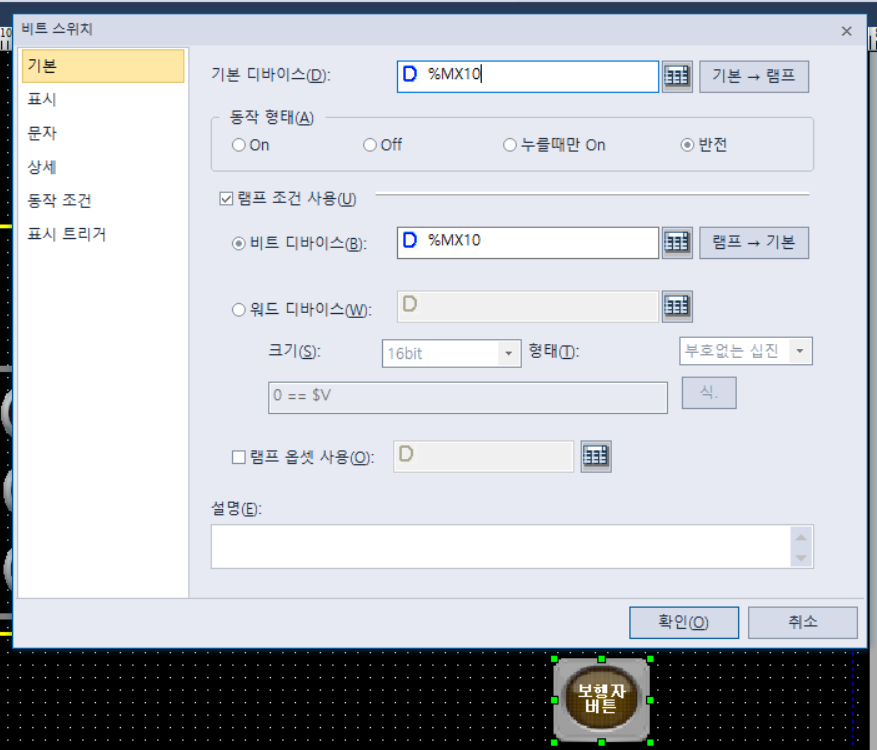 보행자 버튼은 비트 스위치로 PLC 메모리 할당값이랑 디바이스 값을 맞춰준다.