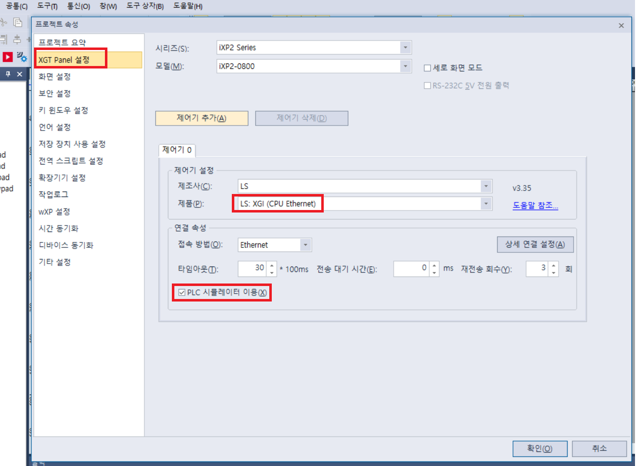 [ XGP Panel 설정 ] 에서 제품이 본인 꺼와 제대로 맞는지 확인하고 PLC 시뮬레이터 이용이 체크되어 있는지 확인한다.