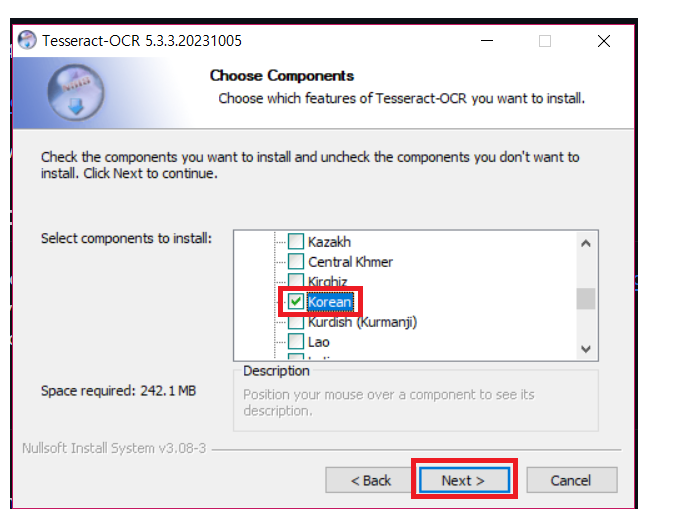[Additional language data] 에서 [Korean]을 추가해 줍니다. ( ABC 순서로 나열된 게 아니어서 잘 찾아야 됩니다..!! )